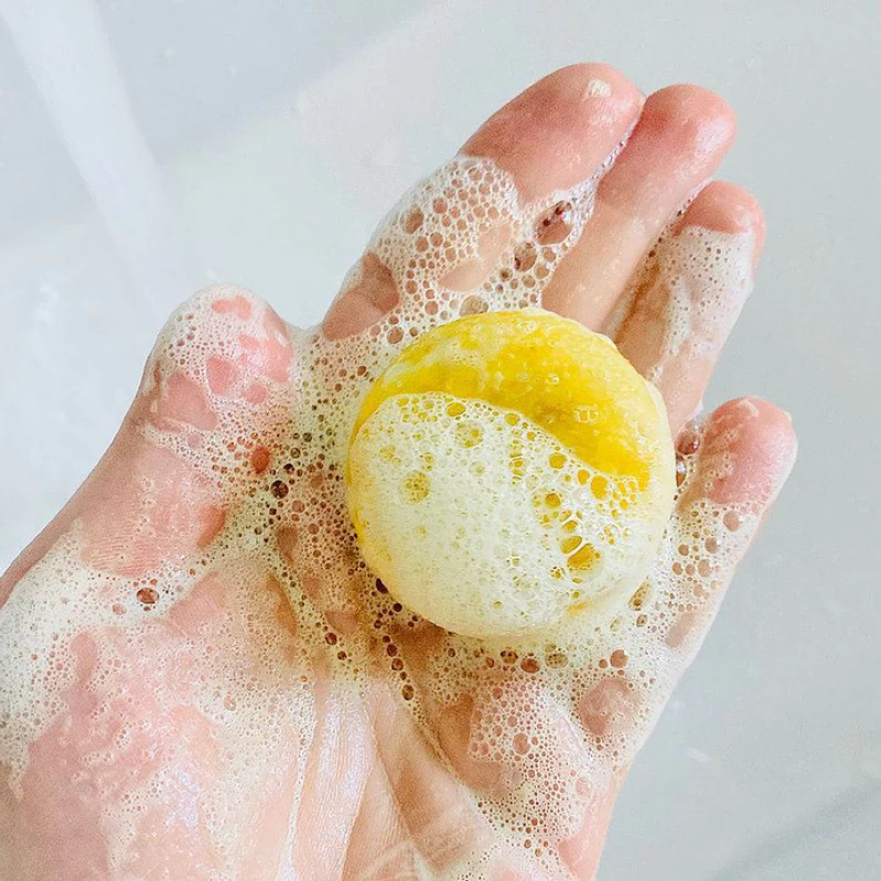 - Bagna il panetto sotto l'acqua corrente, strofinalo tra le mani e applica la schiuma sul viso, oppure applica il prodotto solido direttamente sul viso;
